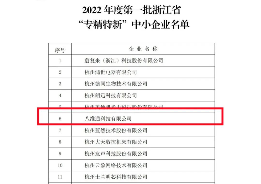 喜訊 | 八維通獲評(píng)浙江省“專(zhuān)精特新”企業(yè)!